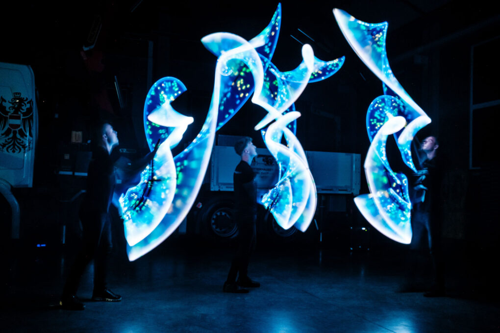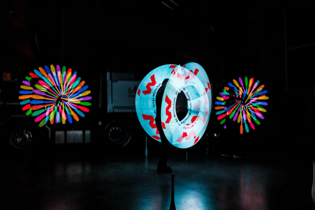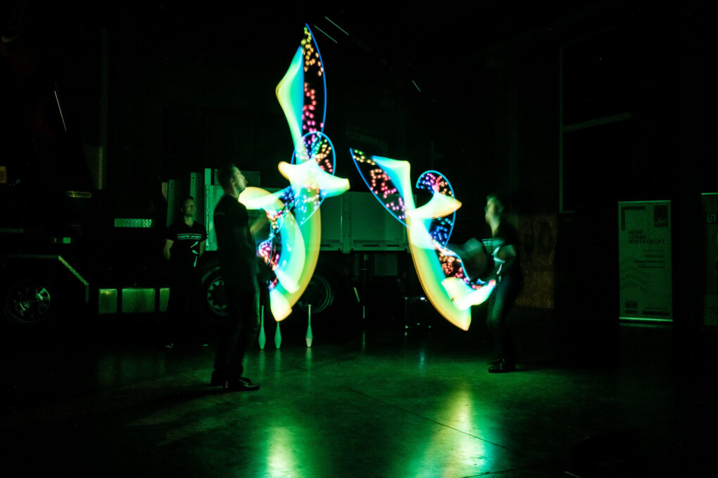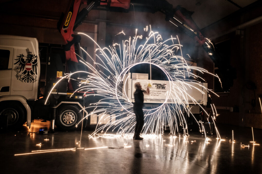 Wir performten für die Gäste unseren Showact “Trilumina” und zeigten auch unser neuestes Pyrotechnik-Requisit – die Pyropois.